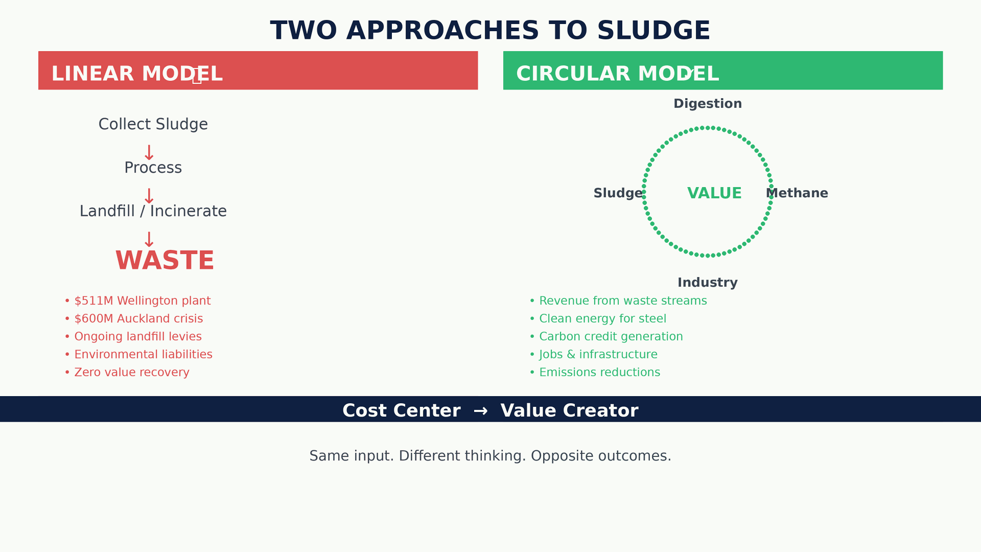 August 2025: Wellington councillors vote to pour another $83 million into their sludge plant — a project that's ballooned from $200m to over $500m. The plan? Thermal hydrolysis to reduce volume, then... disposal.