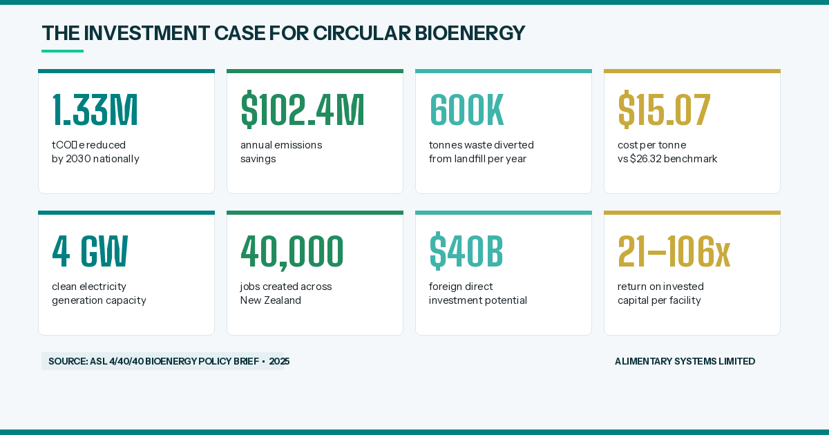 The BRRP generates multiple revenue streams — bioenergy sales, fossil-free organic fertiliser (replacing synthetic fertiliser and reducing nitrous oxide), carbon credits from landfill diversion, and reduced wastewater treatment costs — while directly addressing national emissions targets. ASL's Bioenergy 4/40/40 policy framework demonstrates how this infrastructure can generate 4 GW of clean electricity, create 40,000 jobs, and drive $40 billion of foreign direct investment into New Zealand.