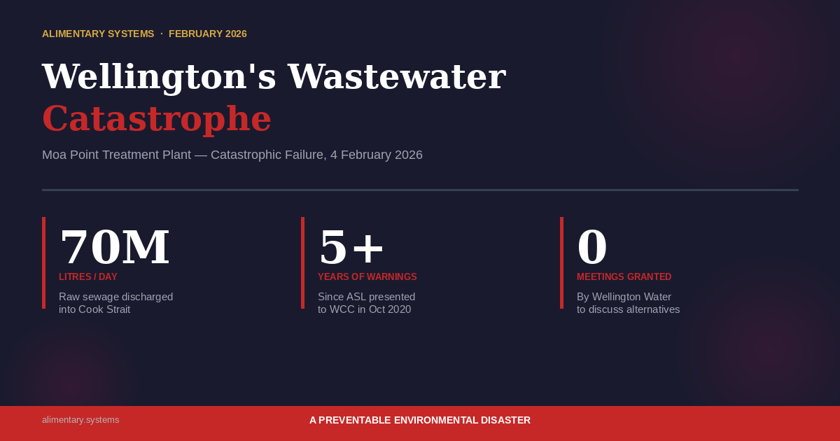 In October 2020, four months before Alimentary Systems was registered as a New Zealand company, our founders presented a circular bioenergy approach to wastewater to the Wellington City Council. The events of February 2026 underscore why this work matters — not just for Wellington, but for communities across the country.