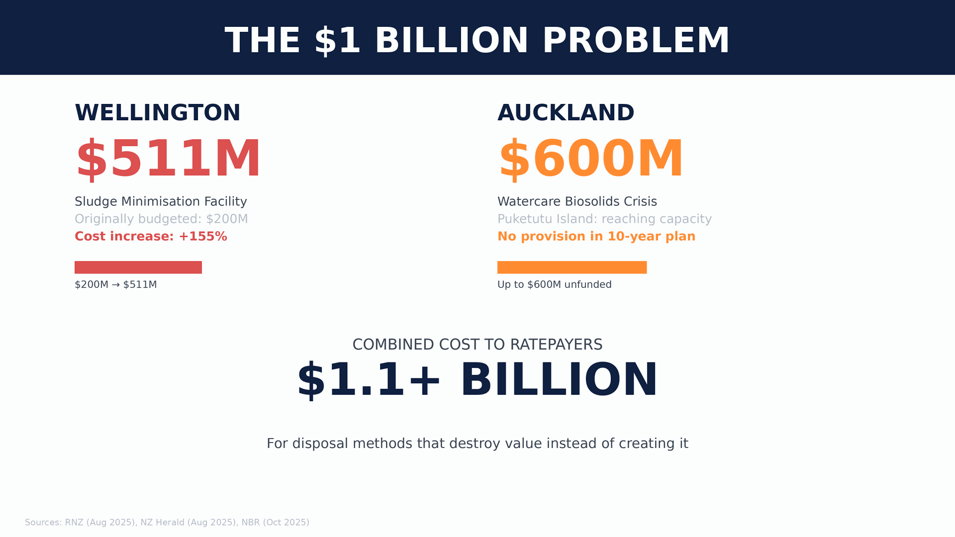 Wellington is spending half a billion dollars on a sludge plant that will reduce volume — then dispose of what's left. Auckland is staring down a $600 million bill to find somewhere new to dump biosolids.
