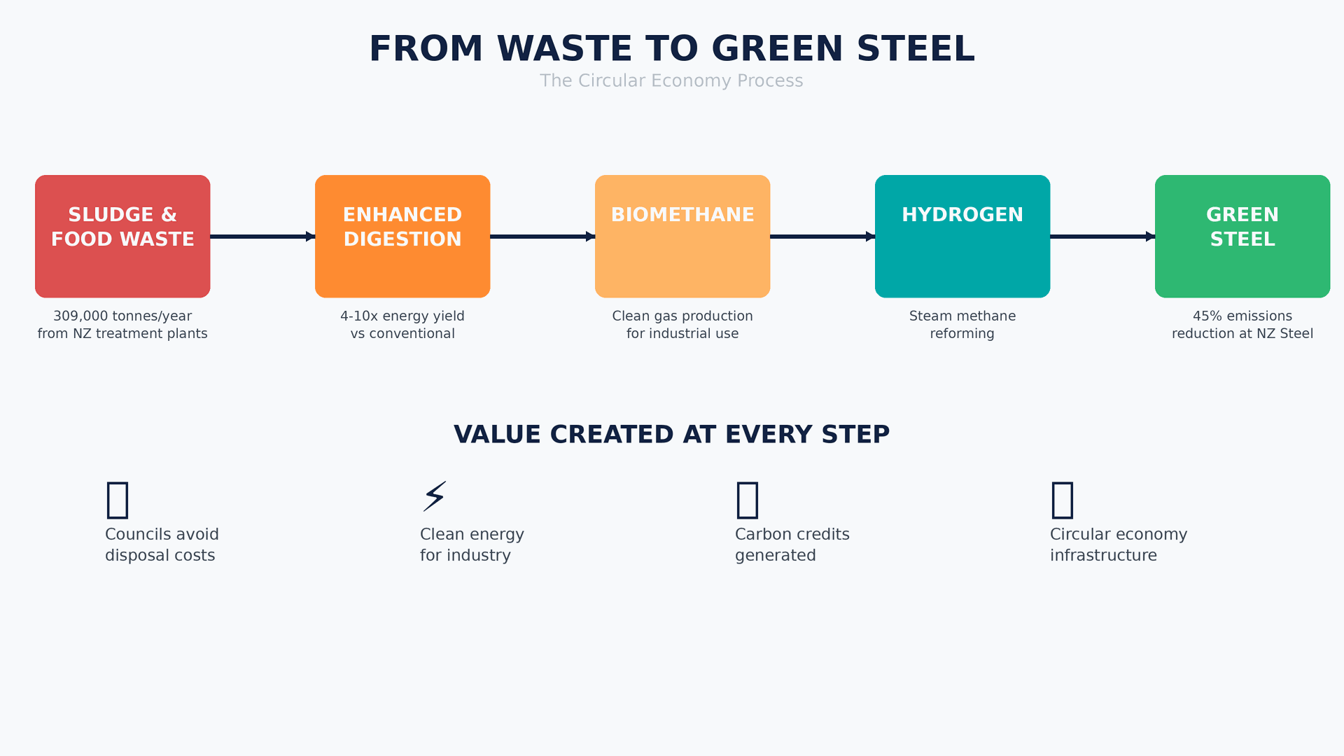 We're building circular economy infrastructure that turns New Zealand's organic waste into clean energy for heavy industry. If you're interested in the opportunity, get in touch.