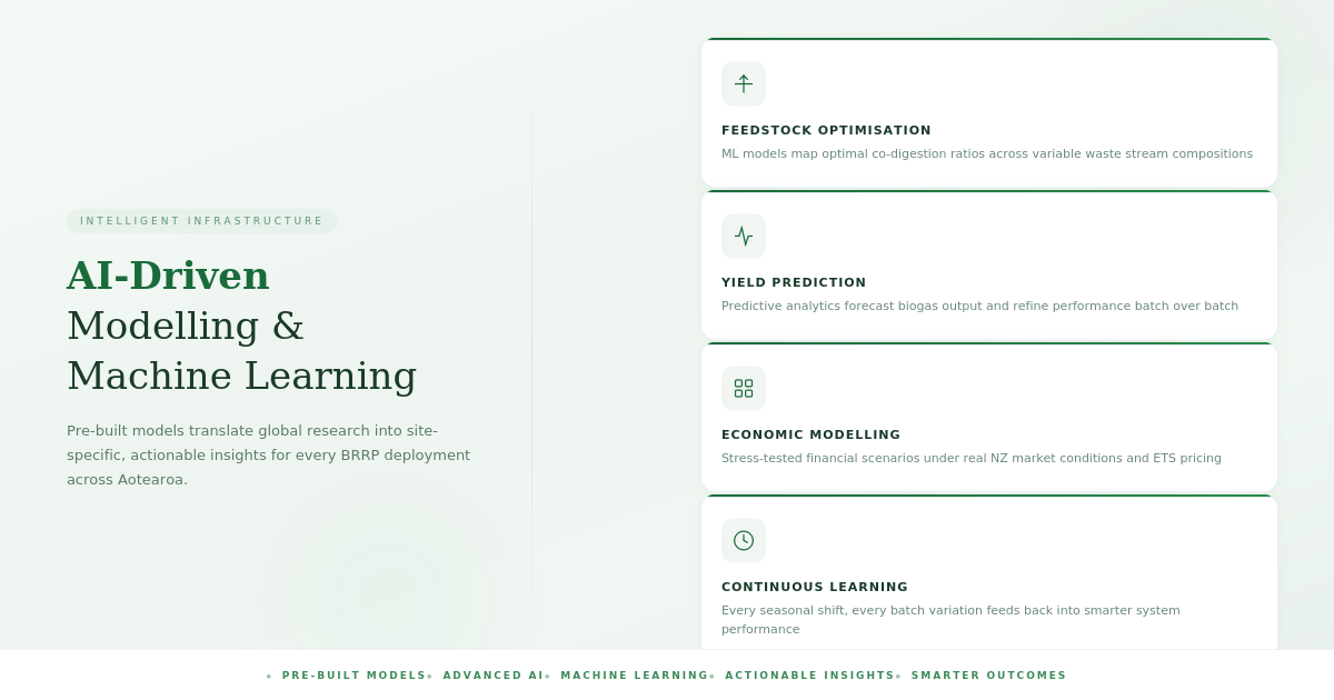 The science is rich — and it's highly sensitive to local conditions. That's precisely why we leverage pre-built modelling frameworks, advanced AI, and machine learning to translate this global body of research into site-specific, actionable insights. Before a single tonne of feedstock enters a BRRP, our models have already mapped the optimal co-digestion ratios for the available waste streams, predicted biogas yields across variable compositions, and stress-tested the economics under real-world New Zealand conditions.