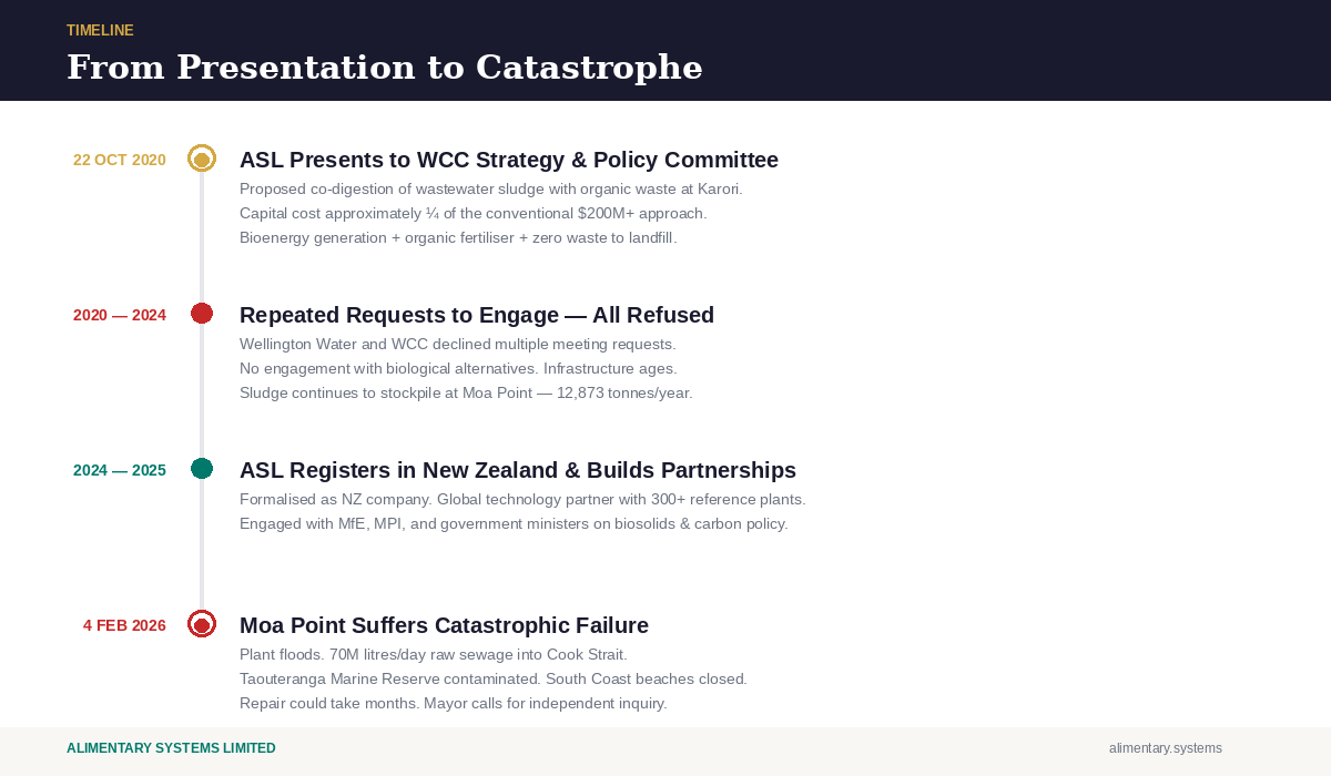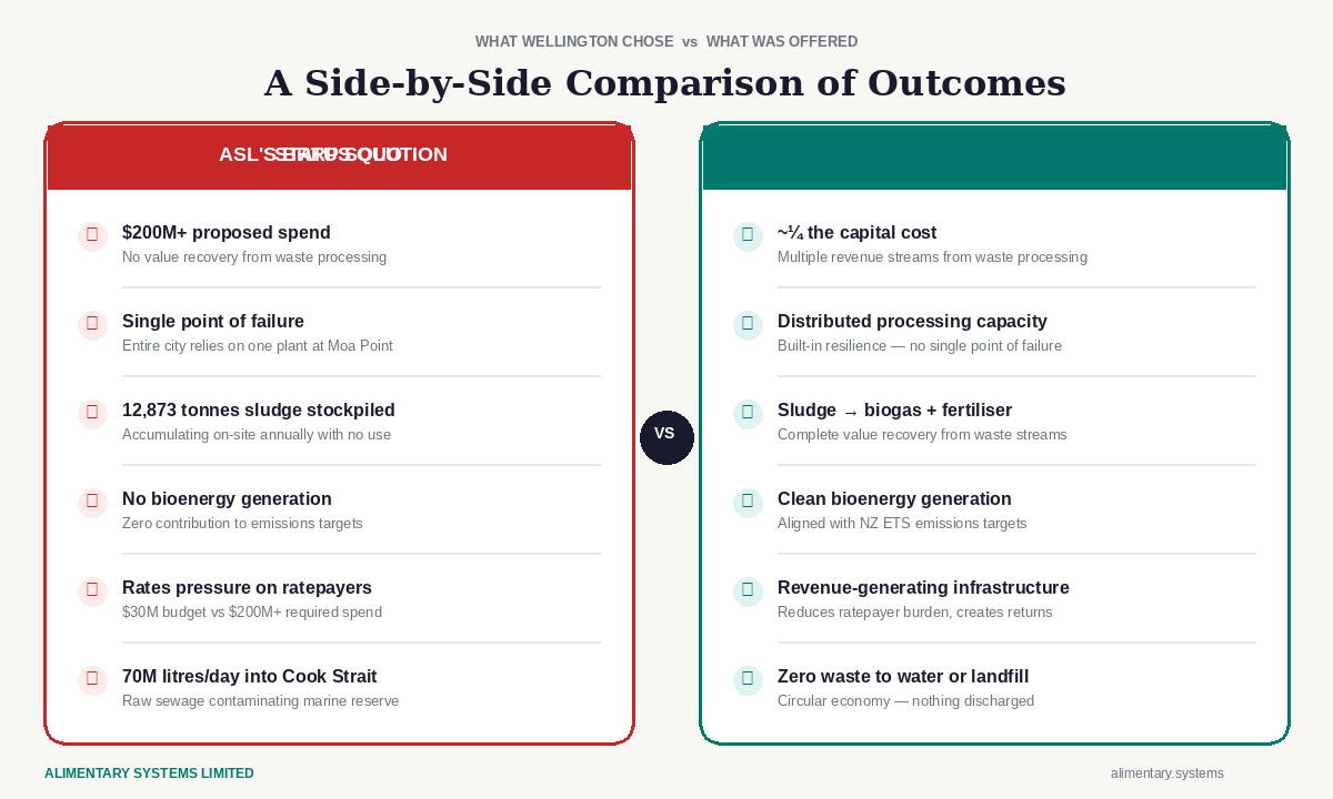 Had Wellington engaged with us in October 2020 — when the company didn't even exist yet — ASL could have been formed with Wellington as a foundation partner. By now, the city could have had operational co-digestion capacity processing wastewater sludge alongside food and green waste. It could have had distributed processing reducing reliance on a single point of failure at Moa Point. It could have had biogas generation offsetting energy costs and contributing to emissions targets. It could have had organic fertiliser production replacing synthetic inputs. And it could have avoided the environmental disaster now unfolding across its South Coast.