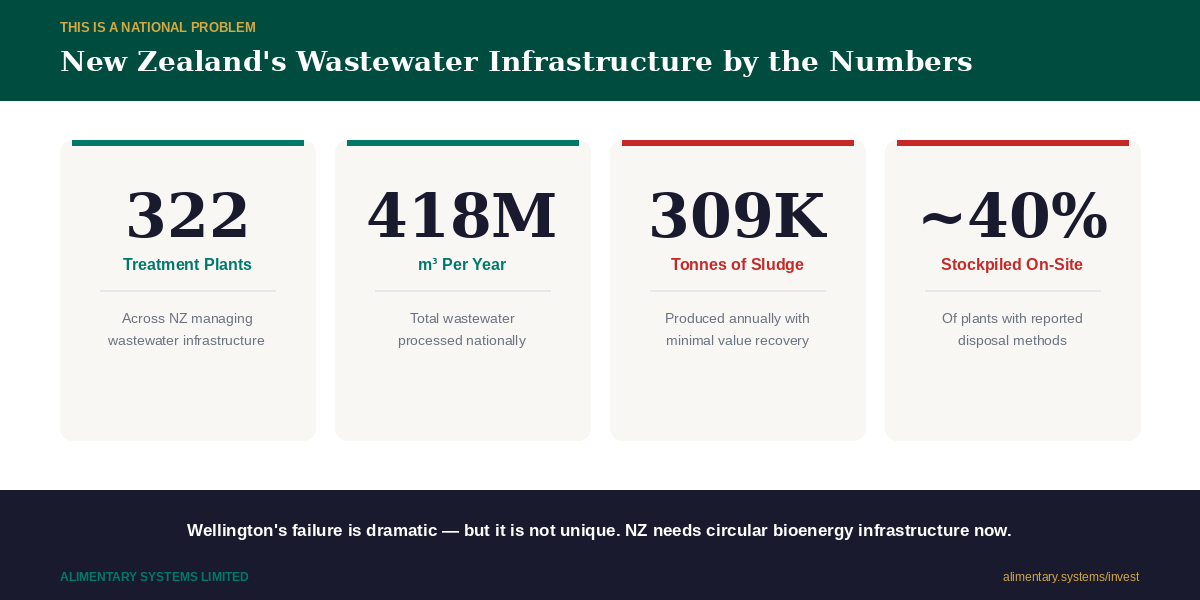 Across New Zealand, 322 wastewater treatment plants manage 418 million cubic metres of wastewater annually, producing over 309,000 tonnes of sludge. Approximately 40% of plants with reported disposal methods stockpile sludge on-site. Another 30% send it to landfill. Only a fraction recover any value.